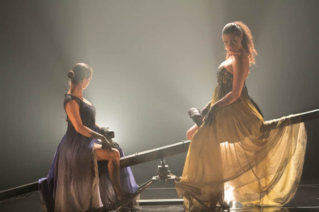 Para enriquecer o movimento constante, um figurino leve que flutua em cena como as duas atrizes. Gosto imensamente da combinação entre o tecido leve dos vestidos e o vai e vem da gangorra. No início, a escuridão e a tinta nos braços cria a ilusão de que somos apresentados a dois seres fragmentados. O espetáculo se inicia e, com força e talento, Caísa e Nara envolvem o espectador sem precisar mover um único dedo. Voz firma, expressões envolventes e um ritmo certeiro para criar uma comicidade sutil.
