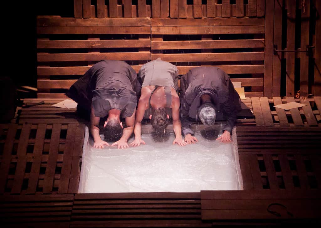 Um ponto forte da montagem é a cenografia, que se desdobra em diferentes tempos e espaços para abrigar o fluxo constante de histórias e personagens. Uma grande estrutura fixa feita de palets mostra-se maleável ao modificar a própria utilidade. Portas que se fecham, caminhos que se cruzam, dias chuvosos e a imensidão do mar. O grupo se desdobra com velocidade para criar pontos específicos em cena que tratem de ambientalizar o espectador. Gosto de como a estrutura cria possibilidades em diferentes níveis, em cima, embaixo, por dentro, no meio encharcado e nas bordas.