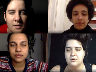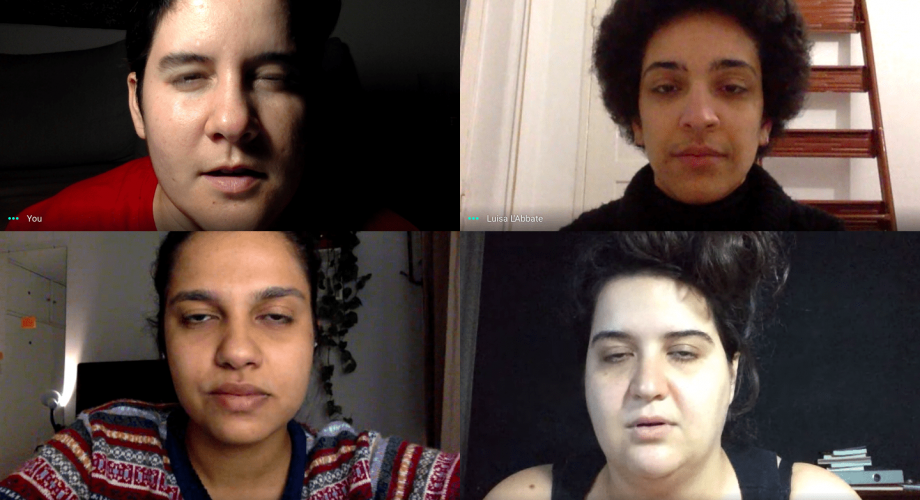 Algumas coisas não estão acontecendo conforme nós imaginávamos. Decidimos fazer uma intervenção. Misturamos nossas cabeças virtuais e nos olhamos pela tela-plana. Atritando referências de diferentes trabalhos anteriores do grupo com nossas experiências de videoconferências, encontramos uma possibilidade.